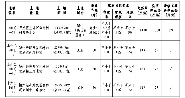 四、本次挂牌出让的详细资料和具体要求,见挂牌出让文件。申请人可于2013年11月5日至2013年12月4日,到阜阳市集中招投标交易中心土地交易中心获取挂牌出让文件。
