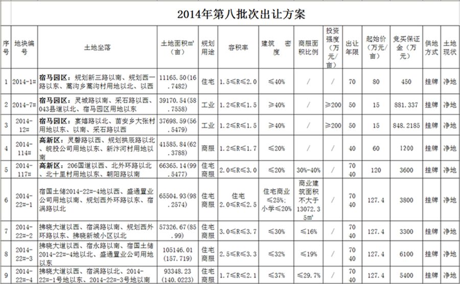 本次国有建设用地使用权出让的详细资料和具体要求,见挂牌出让文件。挂牌时间自2014年6月23日至7月2日17时,在宿州市土地储备发展中心及宿州市公共资源交易中心(宿州市建委大楼一楼105室)进行挂牌,在宿州市土地储备发展中心接受报价,提交竞买申请和竞买保证金到帐的截止时间为 2014年6月30日17时。