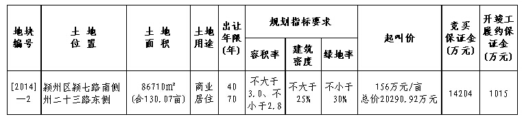 六、本次国有建设用地使用权拍卖会定于2014年7月2日15时在阜阳市集中招投标交易中心举办。