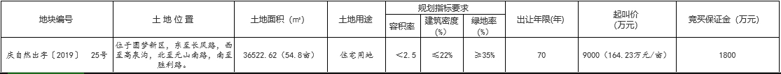 根据《中华人民共和国土地管理法》、《中华人民共和国城市房地产管理法》、《招标拍卖挂牌出让国有建设用地使用权规定》(国土资源部15号令)等法律、法规的规定,经安庆经济技术开发区管委会批准,安庆经开区国土规划建设局决定采取拍卖(挂牌)方式出让庆自然出字[2019]25号地块的国有建设用地使用权。现将有关事项公告如下: