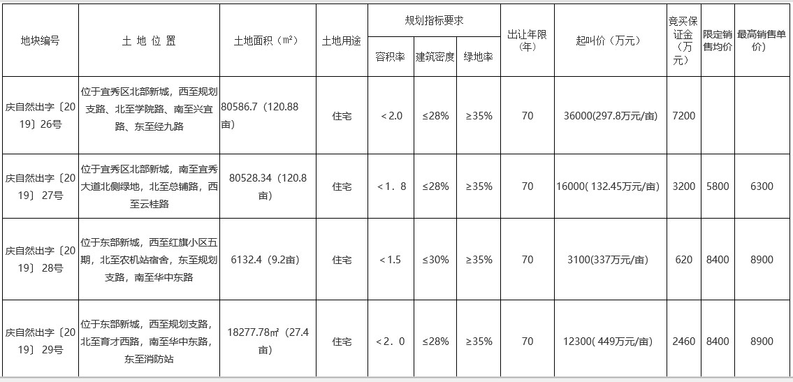 2.庆自然出字〔2019〕27、28、29号地块竞得人开发建设的商品住宅销售对象,仅限于持有房票的购房户(出让地块开发的商业用房销售对象不限)。竞得人不得高于限定销售均价和最高销售单价销售商品住宅。竞得人要公开房源信息,采取公平、公正方式销售,出现需求大于供给的,要采取公开摇号方式确定购买人。