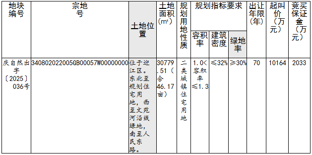 备注:出让地块具体规划指标以安庆市自然资源和规划局出具的规划条件为准,土地准确面积以正式出具的测绘成果为准,出让地块具体情况详见出让文件(地块起叫价不含契税、印花税)。