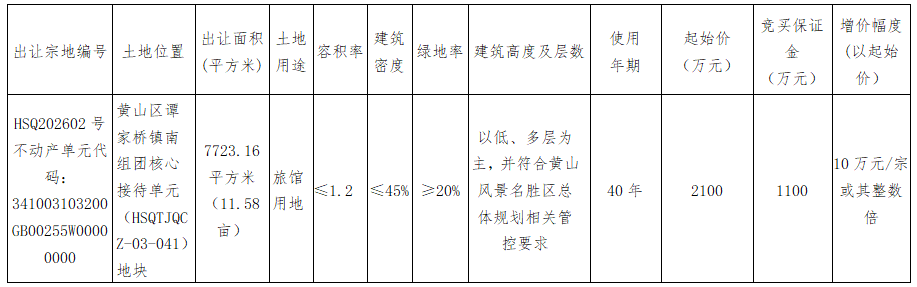 安徽省黄山市5月4日至5月13日挂牌出让谭家桥镇南组团核心接待单元地块使用权