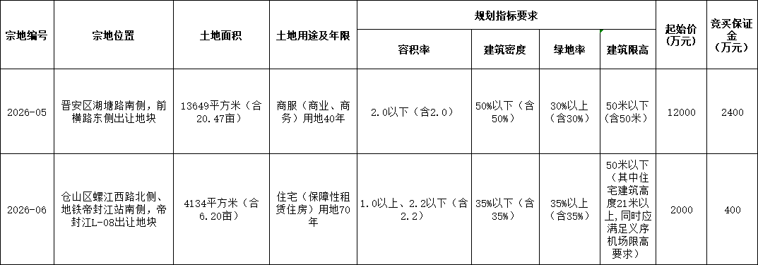 (三)交地时间: 竞得人缴清出让价款后30日内,按照“净地”标准交地;其中宗地2026-06号地块竞得人签订土地出让合同后即可进场,缴清第一期土地款后具备交地条件的,可先予交地。